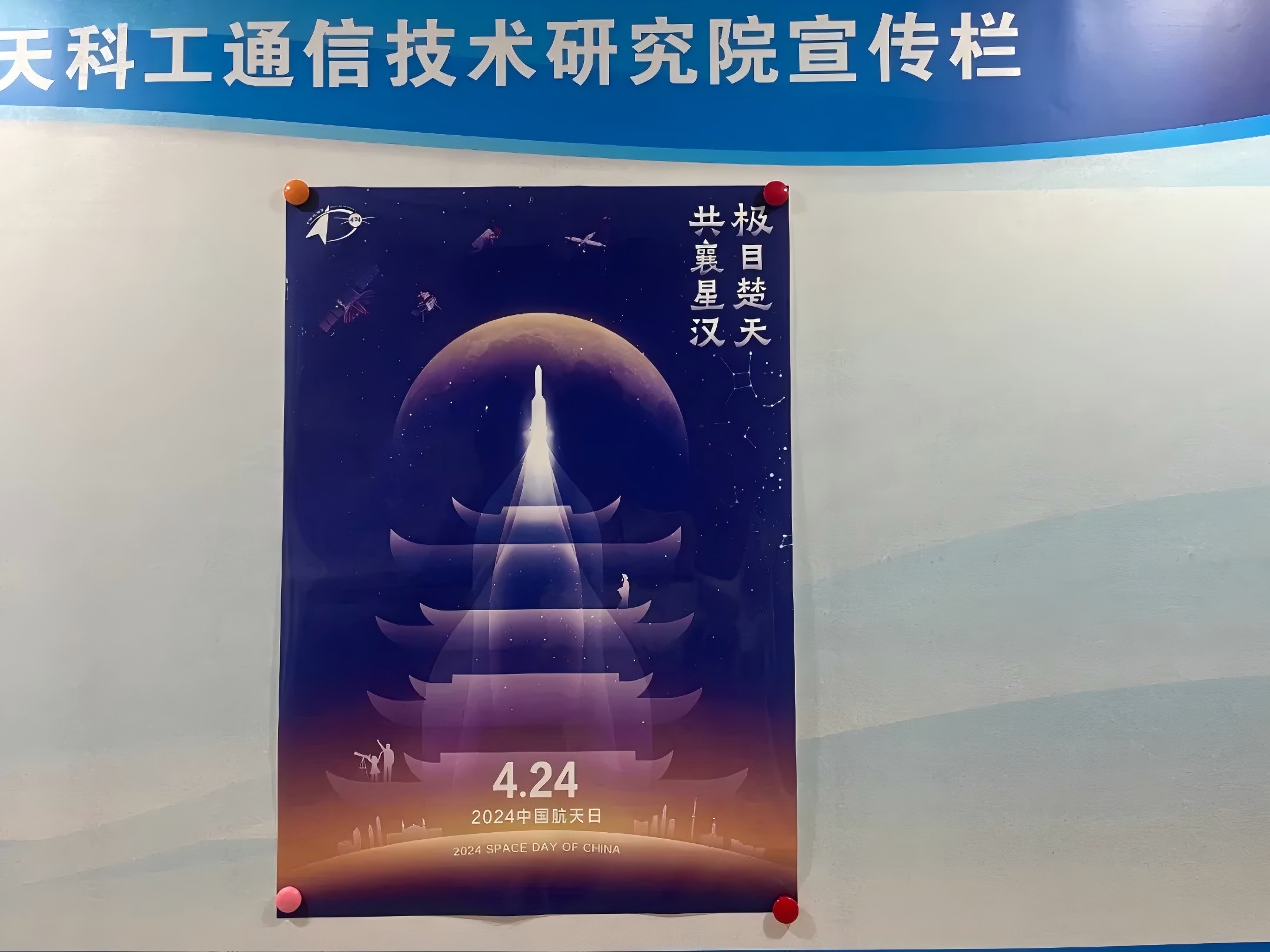 公司宣傳欄處張貼2024年“中國航天日”主題海報,營造濃厚的氛圍。